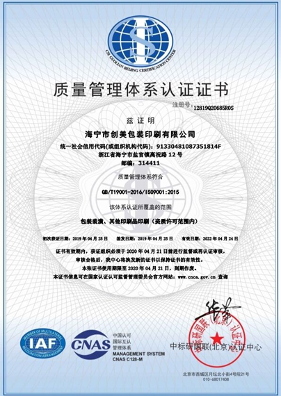 質(zhì)量體系認(rèn)證Certificate of quality system 海寧市創(chuàng)美包裝印刷有限公司自成立以來(lái)堅(jiān)持“以誠(chéng)信為根本、以質(zhì)量求生存、以科技謀發(fā)展、以服務(wù)拓市場(chǎng)”的經(jīng)營(yíng)理念,特別是視質(zhì)量為生命,以誠(chéng)心為客戶(hù)服務(wù)為己任,使企業(yè)在日益激烈的市場(chǎng)競(jìng)爭(zhēng)中得到長(zhǎng)足發(fā)展。為此,創(chuàng)美包裝務(wù)實(shí)創(chuàng)新,引進(jìn)ISO9001:2015質(zhì)量管理體系,通過(guò)對(duì)全體員工的宣傳、培訓(xùn),建立了一套符合國(guó)際標(biāo)準(zhǔn)要求的質(zhì)量管理體系,并嚴(yán)格按照質(zhì)量管理體系文件中的規(guī)定執(zhí)行、實(shí)施,在執(zhí)行過(guò)程中不斷的改進(jìn)和完善,使公司形成了一個(gè)系統(tǒng)、完善的管理體系,提高了全體員工的工作質(zhì)量和工作效率,進(jìn)一步保證了產(chǎn)品質(zhì)量、服務(wù)質(zhì)量和公司的管理質(zhì)量,為公司持續(xù)發(fā)展,不斷改進(jìn)和提升奠定了堅(jiān)實(shí)的基礎(chǔ)。獲得ISO9001:2015認(rèn)證是創(chuàng)美包裝新的起點(diǎn),我們一定會(huì)借此契機(jī),提供質(zhì)量更佳的產(chǎn)品,讓客戶(hù)滿(mǎn)意。